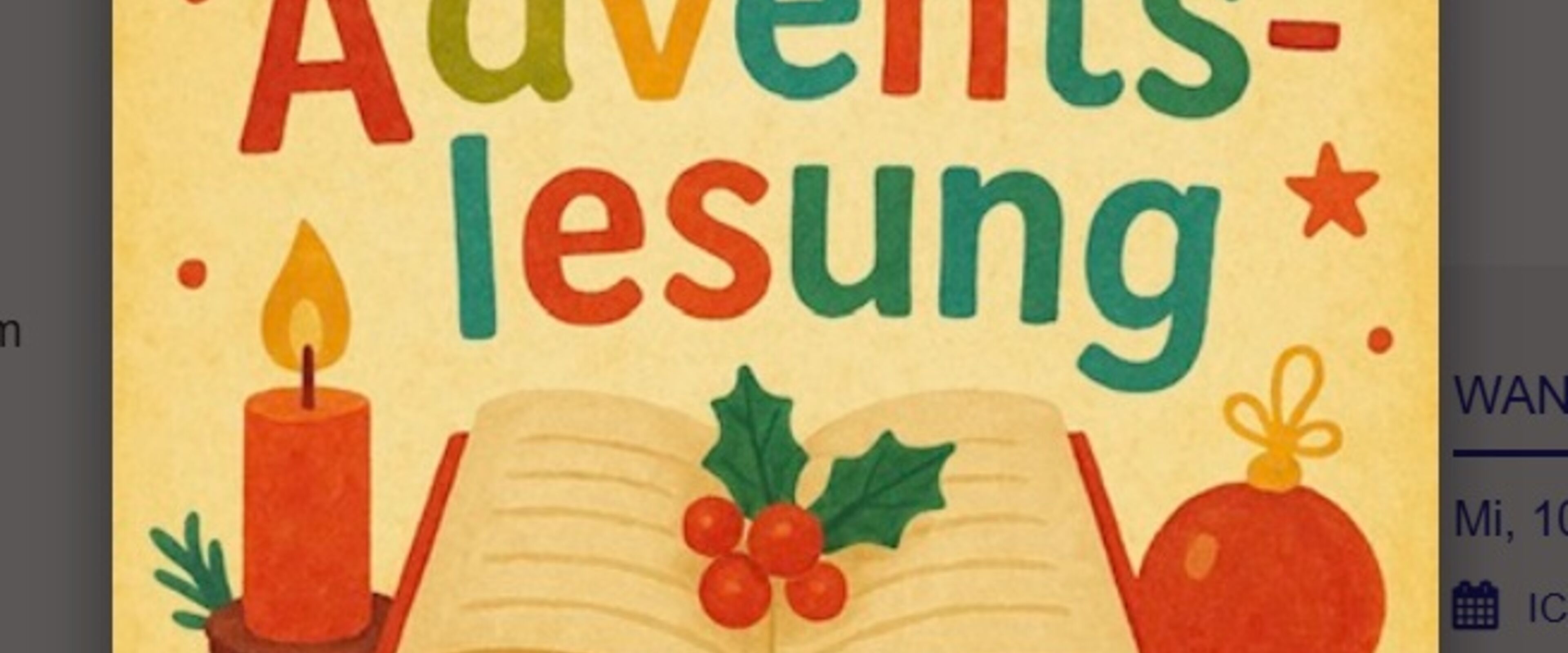 Immer mal was Neues: Wir sind Adventsstimmung und möchten gern gemeinsam mit Ihnen in Büchern und Geschichten stöbern. Verschiedene Gemeindeglieder lesen vor und Sie lauschen, entspannen, tauschen sich aus.... Neugierig? Dann unbedingt vorbeikommen. :-)